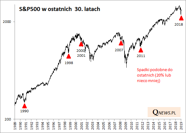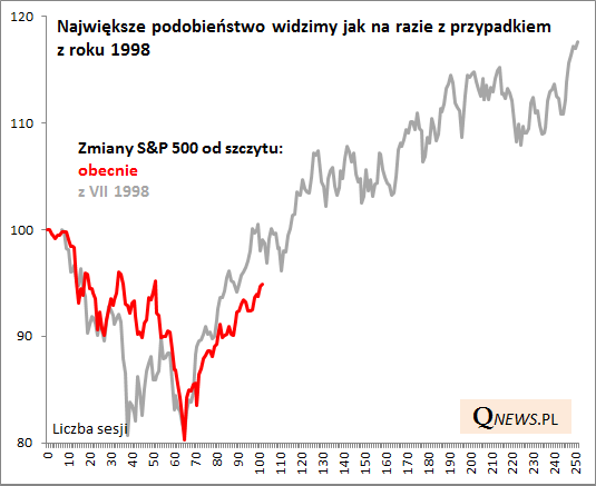 Jeśli analogia z 1998 rokiem miałaby się utrzymać, to S&P 500 powinien z czasem sięgnąć po nowe rekordy. Ta analogia jest ciekawa także z innych względów. Podobnie jak teraz wyprzedaż w 1998 roku miała miejsce pod koniec długotrwałego boomu w USA, kiedy stopa bezrobocia spadła do niskich pułapów, a turbulencje rynkowe (szczególnie na rynkach wschodzących - kryzys rosyjski i zagrożenie systemowe w postaci upadku potężnie zalewarowanego funduszu hedgingowego LTCM) przestraszyły Fed i skłoniły go do zmiany retoryki. Co ciekawe po pewnym czasie, w połowie 1999 Fed wznowił jednak podwyżki stóp. Hossa ostatecznie miała dobiec końca wiosną 2000 roku. Czytaj też: szczyt hossy przed recesyjną bessą najwcześniej za półtora roku?