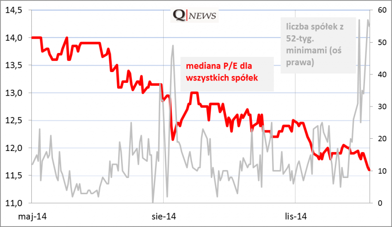 Jakże odmienna jest sytuacja na warszawskim parkiecie od tego co dzieje się za oceanem. Ostatnie sesje przed świętami przyniosły wysyp nowych 52-tygodniowych minimów notowań (nawet ponad 50 spółek dziennie!), co według naszej interpretacji może być (tak jak w sierpniu) zapowiedzią pewnego przesilenia. Tym bardziej, że na dłuższą metę ostatnia "promocyjna wyprzedaż" jeszcze bardziej obniżyła wyceny akcji.