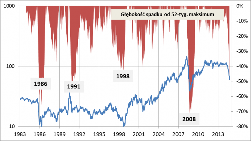 Gwałtowna przecena ropy wyhamowała, ale nie widać jeszcze poważniejszej próby podniesienia notowań. Już teraz fala spadkowa należy do sześciu najsilniejszych w historii, choć w porównaniu np. z tą z 2008 r. nie jest jeszcze skrajnie głęboka (gdyby czysto hipotetycznie założyć, że cena miałaby spaść o tyle co w 2008 r., to spadek zatrzymałby się dopiero gdzieś w okolicach 35 USD za baryłkę w przypadku ropy Brent). Historia pokazuje jednocześnie, że notowania ropy potrafiły się często odbijać równie szybko i gwałtownie jak wcześniej spadały.