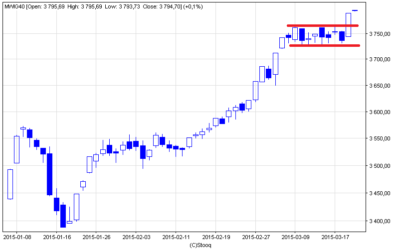 Na koniec spójrzmy na teoretycznie najszerszy, ale w praktyce zdominowany raczej przez duże spółki, indeks WIG. Można powiedzieć, że jest to ostatni brakujący element układanki. Dlaczego? Bo od jesieni 2013 r. WIG tkwi uparcie w jednym z najdłuższych w swej historii trendów bocznych. Wygląda jednak na to, że w trakcie obecnej fali wzrostowej indeks może pokusić się o atak na górną granicę tego trendu. Gdyby to się udało, byłby to sygnał powracającej hossy.