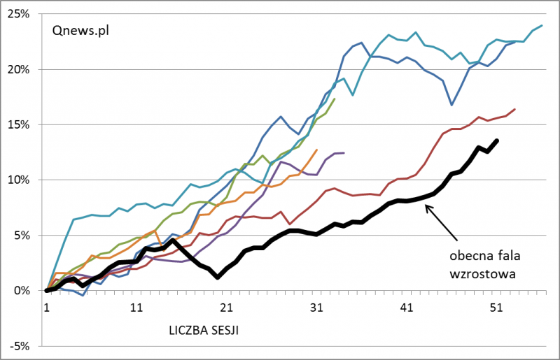 Co w przeszłości działo się po zakończeniu poszczególnych fal zwyżkowych? Zasięg korekt był mocno zróżnicowany - sięgał od 5% do nawet 15% (wiosna 2012). Średnio było to niecałe 8%.