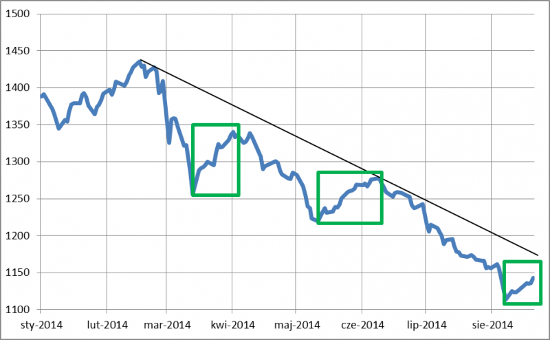 Rys. 3. Obecna korekta wzrostowa WIG250 na tle dwóch poprzednich