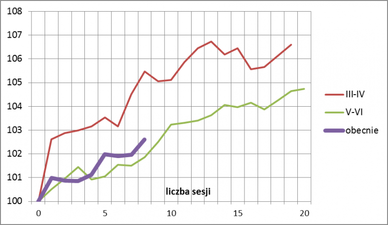 Na podstawie powyższego zestawienia nasuwają się dwa wnioski. Po pierwsze tempo obecnej korekty nie odbiega od schematów nakreślonych przez poprzednie dwie fale wzrostowe. To tym bardziej uzasadnia takie porównania. Po drugie zarówno pod względem czasu trwania, jak i zasięgu obecny ruch jest już mniej więcej w połowie drogi do potencjalnego szczytu. Dosłowne potraktowanie tego zestawienia pozwala oczekiwać, że korekta może potrwać gdzieś jeszcze jakieś dwa tygodnie.