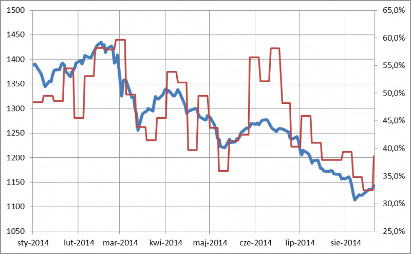 Rys. 4. WIG250 i odsetek byków w ankiecie SII (skala prawa)