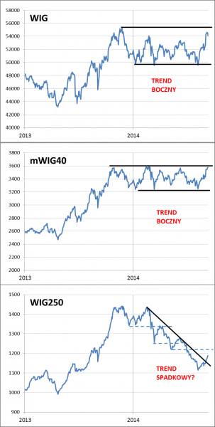 O ile jeszcze miesiąc temu można było się obawiać, że WIG czy mWIG40 pójdą w ślady małych spółek i wybiją się dołem z trendów bocznych, to teraz nagle pojawia się świetlana wizja wybicia górą, czyli de facto kontynuacji hossy z 2013 r. Nawet indeks „maluchów” (WIG250) zdołał przebić linię trendu spadkowego.