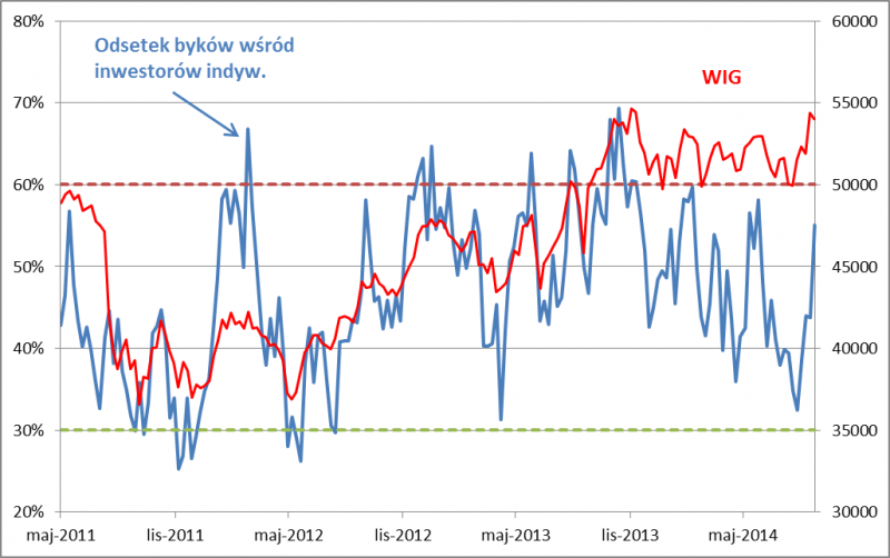 Rys. 3. WIG i odsetek byków w ankiecie Stowarzyszenia Inwestorów Indywidualnych