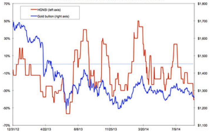 Rys. 4. Nastroje na rynku złota (Hulbert Gold Newsletter Sentiment Index) i cena kruszcu