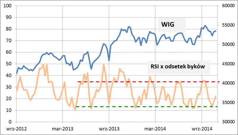 WIG kroczek po kroczku wspina się z powrotem ku szczytom hossy. Wraz z nim drogę w górę przemierzają nasze ulubione wskaźniki krótkoterminowego cyklu: oscylator techniczny RSI oraz wskaźnik nastrojów Stowarzyszenia Inwestorów Indywidualnych. RSI znalazł się powyżej neutralnego poziomu 50 pkt., zaś odsetek byków w ankiecie SII zawędrował powyżej 43% wobec 34,5% tydzień wcześniej (odsetek niedźwiedzi spadł z kolei z 39% do 26% - poziom najniższy od pięciu tygodni). Nasz „wynalazek”, będący połączeniem tych dwóch wskaźników wyszedł ze strefy bardzo niskich odczytów (gdzie tradycyjnie pojawiają się okazje do „podkupywania” akcji), ale na szczęście jeszcze nie jest na wysokich pułapach (gdzie warto zachować wzmożoną ostrożność).