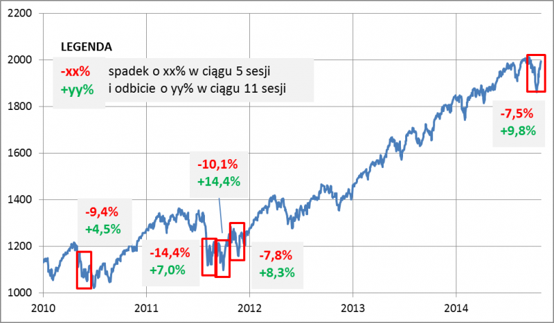 Październik 2014 r. zapisał się na kartach historii Wall Street jako miesiąc pod znakiem wyjątkowej zmienności i gwałtownych zwrotów akcji. Po 7,5% zjeździe w ciągu pięciu kolejnych sesji, na następnych jedenastu sesjach (do czwartku) S&P 500 poszybował w górę o 9,8% (obliczenia w oparciu o ceny w trakcie sesji, a nie na zamknięciach). Postanowiliśmy prześwietlić dane historyczne w poszukiwaniu podobnych epizodów.