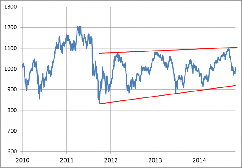 Indeks MSCI Emerging Markets jest mniej więcej w połowie przedziału wahań w ramach kilkuletniego trendu bocznego.