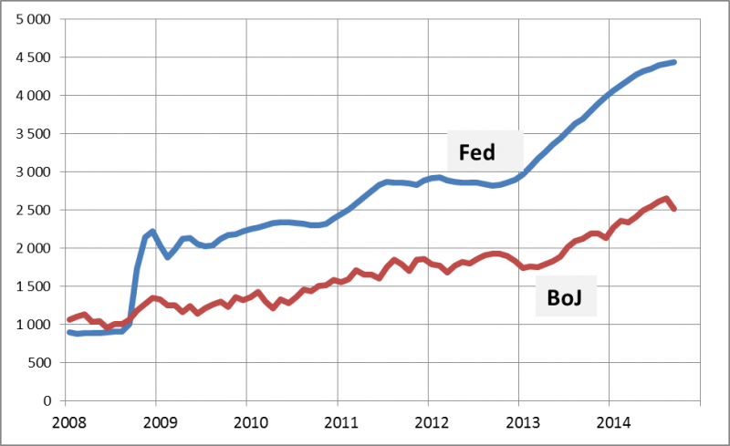 Mijający tydzień przyniósł dwie ważne informacje. Pierwsza, od dawna oczekiwana, to koniec luzowania ilościowego (QE) w USA – Fed zgodnie z nakreślonym wcześniej harmonogramem zdecydował o całkowitym wygaszeniu skupu aktywów. W skali globalnej nie oznacza to wszakże końca wzrostu płynności. Koniec amerykańskiego QE zbiegł się (przypadkowo?) w czasie z zaskakującą decyzją japońskiego banku centralnego (BoJ) o powiększeniu skali tamtejszego QE. Baza monetarna ma rosnąć nie o 60-70 bln jenów rocznie jak do tej pory, lecz o 80 bln. Przypomnijmy że wcześniej zwiększenie sumy bilansowej zadeklarował też Europejski Bank Centralny.