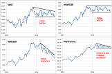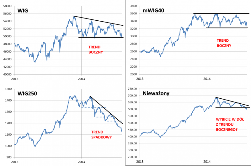 Mijający tydzień przyniósł sporo nowości, jeśli chodzi o sytuację techniczną na wykresach indeksów GPW. Są to raczej nowości na minus niż na plus. O ile słaba kondycja małych spółek (WIG250) nie jest taką nowością, to w tym samym kierunku zaczynają ciążyć pozostałe segmenty rynku. WIG jak i np. mWIG40 (średnie spółki) zbliżyły się do dolnych granic trendów bocznych trwających już ponad pół roku. Nasz indeks nieważony już nawet znalazł się poniżej poziomów wsparcia na wysokości ostatnich dwóch lokalnych dołków.