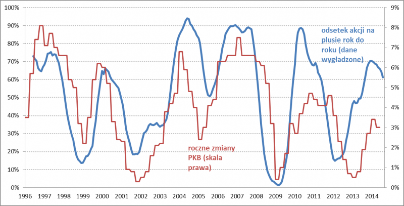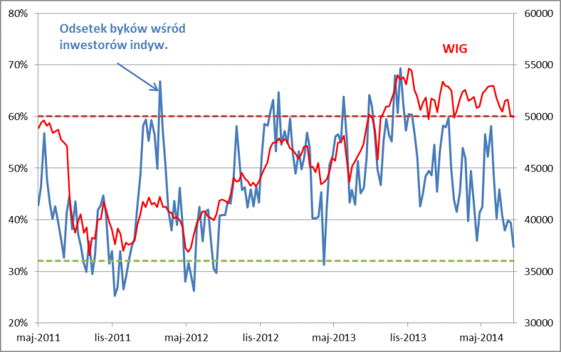 Odsetek byków w ankiecie Stowarzyszenia Inwestorów Indywidualnych obniżył się w tym tygodniu do 34,8%. Tak niski poziom optymizmu nie był od 15 miesięcy. Otwartą kwestią pozostaje jednak to czy optymistów jest już wystarczająco mało, by ruszyć z agresywnymi zakupami akcji. Historyczne dołki wskaźnika ustanawiane były w przedziale 25-26%. Jeśli założymy, że indeksy nie wybiją się ze wspomnianych wyżej trendów bocznych, obecny relatywnie niski poziom optymizmu może być zachętą do akumulacji. Gdyby jednak doszło do wybicia w dół, należałoby oczekiwać dalszego szybkiego skurczenia się odsetka byków w kierunku historycznych minimów i tam dopiero pojawiłaby się okazja do zakupów.