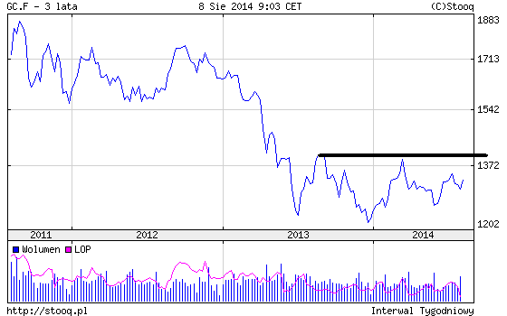 Od miesięcy nasza diagnoza na temat rynku cennego kruszcu jest taka, że mamy do czynienia z trendem bocznym, z opcją wyjścia górą, szczególnie w razie turbulencji na rynkach akcji. Taki żmudny proces udeptywania dna jest cały czas kontynuowany.