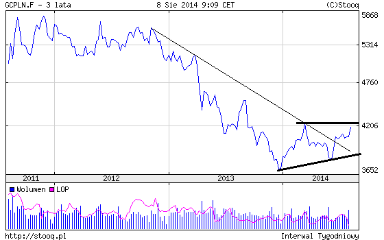 Szczególnie interesująco wygląda sytuacja techniczna na wykresie notowań złota w PLN, gdzie kurs przymierza się do wybicia z formacji „trójkąta”.