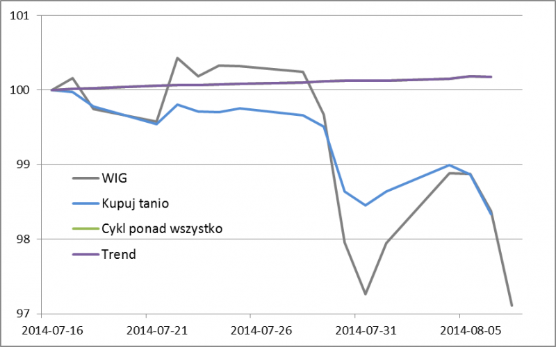 Spośród naszych hipotetycznych strategii najlepiej sprawdzają się na razie „Cykl ponad wszystko” i „Podążaj za trendem” – obie zakładają obecnie trzymanie bezpiecznych aktywów (QUERCUS Ochrony Kapitału), tyle że z różnych powodów (w pierwszym przypadku jest to cykliczny spadek tzw. wskaźników wyprzedzających zapowiadający schłodzenie koniunktury gospodarczej, a w drugim – słaba postawa indeksu nieważonego). Najsłabiej radzi sobie póki co strategia „Kupuj tanio”, która niedawno zwiększyła udział akcji (QUERCUS Agresywny) z 50% do 60% za sprawą dalszego spadku wskaźnika P/E. Póki co oczywiście historia naszej symulacji liczy sobie dopiero kilka tygodni.