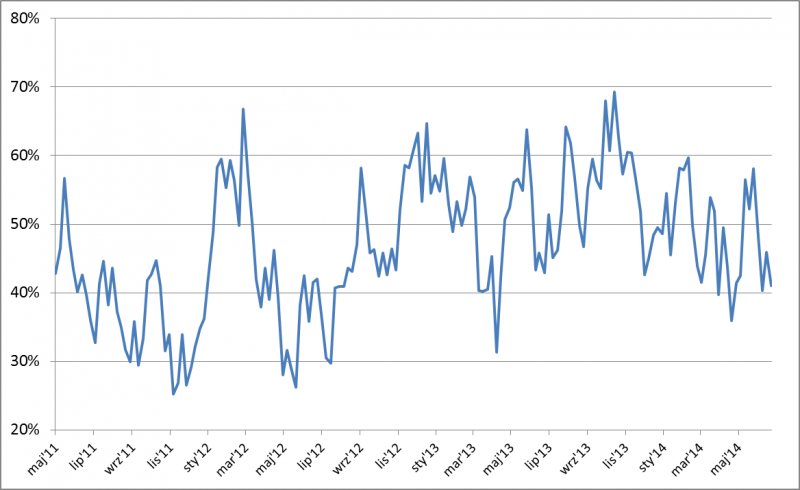 W tym tygodniu wskaźnik spadł ponownie do poziomu 41%, czyli w okolicę minimów zanotowanych kilkakrotnie w trakcie ostatnich czterech miesięcy. Biorąc pod uwagę niskie poziomy opisywanych przed tygodniem wskaźników technicznych (RSI) aż się prosi o jakąś próbę większego odreagowania spadków. Inna sprawa, że o ile owe 41% to poziom bardzo niski w skali ostatnich kilkunastu miesięcy, to jednak ciągle nie aż tak niski na tle całej historii wskaźnika. Historyczne minima zostały ustanowione w latach 2011-2012 tuż poniżej pułapu 30%.