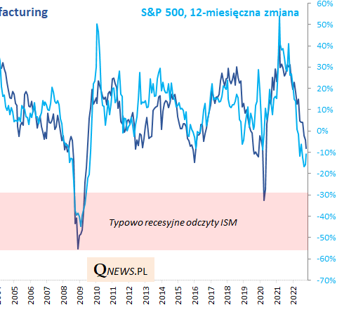 • Teraz gra toczy się o to czy potencjał spadkowy ISM już uległ wyczerpaniu (tak jak w latach np. 2016 lub 2012), czy raczej wskaźnik będzie zmierzał ku poziomom znanym z poprzednich trzech recesji, czyli w okolicę czterdziestu kilku punktów (ostatnie trzy recesyjne dołki ISM to 41,5; 34,5; 40,8). Z uwagi na opisywane przez nas recesyjne sygnały takie jak głębokie odwrócenie krzywej rentowności z tym drugim scenariuszem należy się liczyć - i nie jest on uwzględniony w cenach akcji, bo zejście ISM na dużo niższe pułapy wymagałoby odpowiedniego dostosowania 12-miesięcznej dynamiki S&P 500.