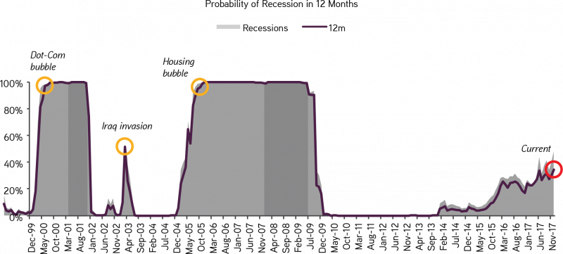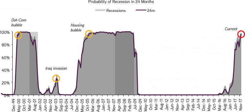 Ale jeśli spojrzymy na następne 24 miesiące, sprawa wygląda już zupełnie odmiennie. W takim horyzoncie czasowym prawdopodobieństwo recesji rośnie do ... niemal 100%. Innymi słowy, zdaniem KKR jest praktycznie pewne, że najpóźniej do końca 2019 roku amerykańska gospodarka wpadnie w większe tarapaty. Poprzednio model pokazał takie prawdopodobieństwo w końcowym okresie bańki na rynku nieruchomości (przełom lat 2005/2006), a wcześniej - w kulminacyjnym okresie bańki internetowej (2000 rok)...