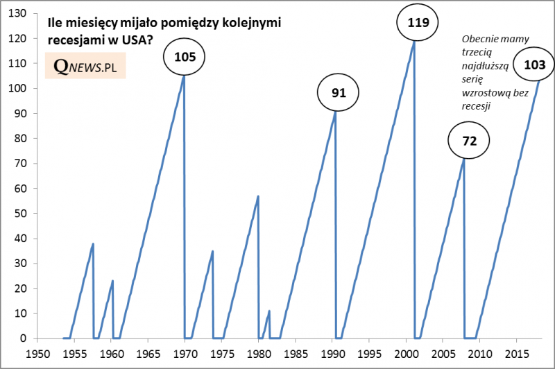 Kolejny miesiąc za nami, co oznacza, że automatycznie przesuwa się nasz licznik czasu, jaki upłynął od ostatniej oficjalnej recesji w USA (i związanego z tym globalnego spowolnienia, które nie ominęło też Polski). Czas ten wydłużył się właśnie do ... 103 miesięcy.