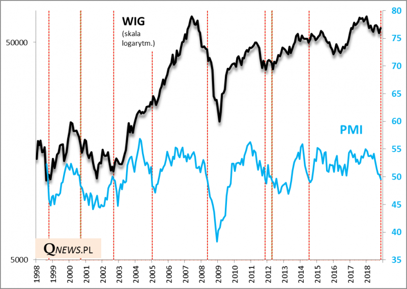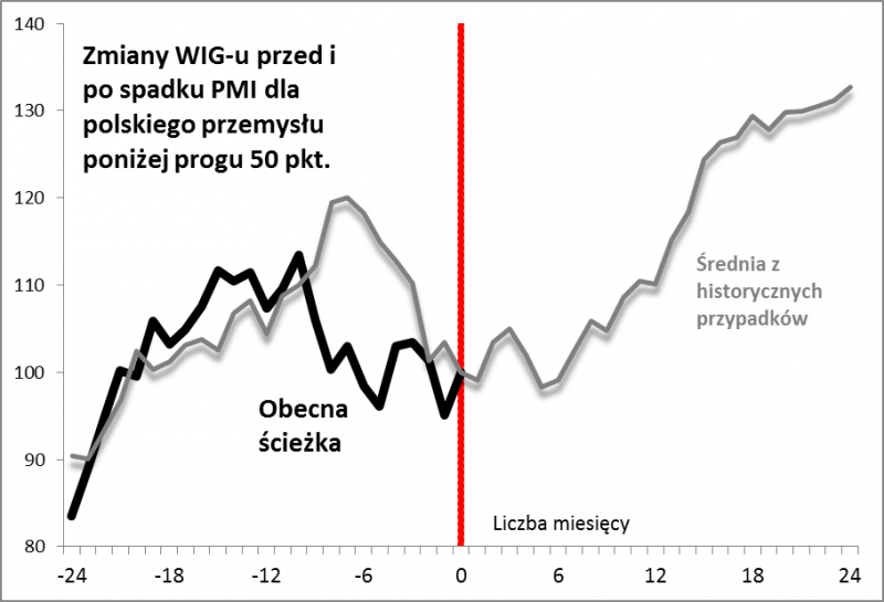 • WIG średnio rzecz biorąc zaczynał z ponad półrocznym wyprzedzeniem dyskontować to co później sygnalizował spadek PMI poniżej granicy 50 pkt.;