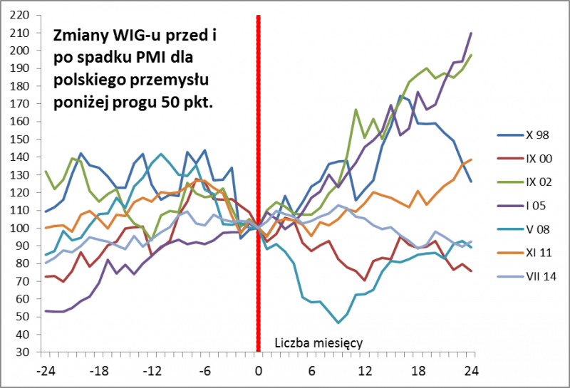 Zobaczmy dokładnie co działo się na GPW przed i po spadku PMI poniżej "magicznej" granicy 50 pkt. Sygnał ten tylko w niektórych przypadkach (2008, 2000) był zwiastunem głębokiego spowolnienia w całej gospodarce, w pozostałych (a tych była większość) kończyło się na przejściowej zadyszce.