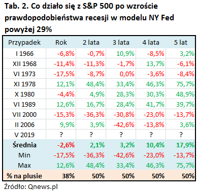 Historycznie taki odczyt modelu nowojorskiego Fedu zapowiadał niemal zawsze recesję w ciągu 6-23 miesięcy (średnio 13). Tyle tylko, że w tym samym czasie scenariusze dla Wall Street były zupełnie rozbieżne – raz nadchodziła bessa (jak w ostatnich dwóch przypadkach), innym razem stopy zwrotu były … sporo na plusie.