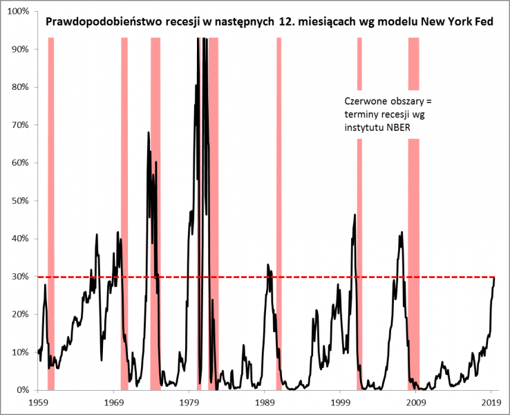 - Najwyższy od 2007 roku, prawie 30-proc. poziom prawdopodobieństwa recesji w modelu New York Fed, to wg historii niemal gwarancja nadejścia owej recesji w USA;