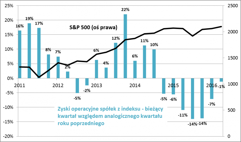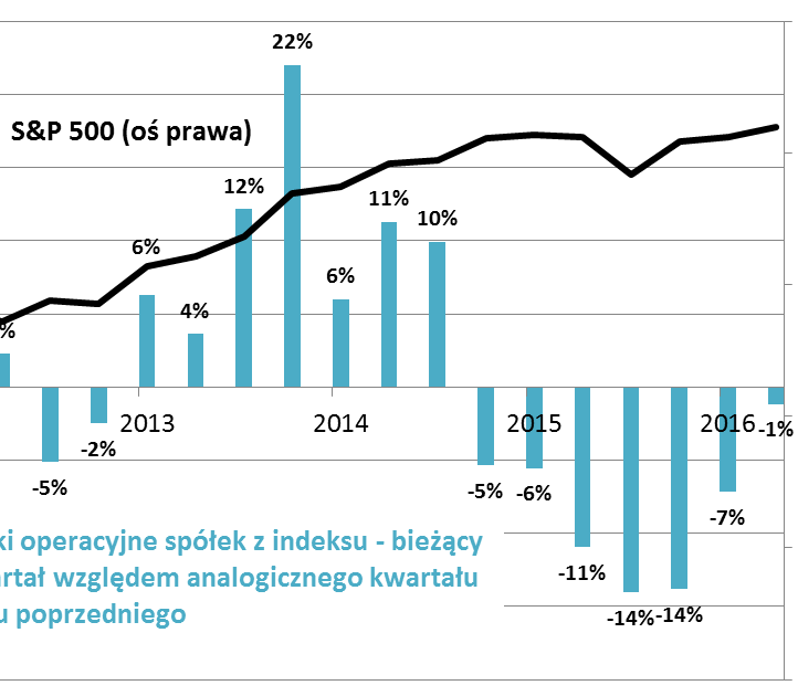Biorąc pod uwagę fakt, że kursy akcji z wyprzedzeniem informują na temat przyszłych trendów w rezultatach, należałoby oczekiwać, że - skoro S&P500 jest na historycznych szczytach - to kolejne kwartały powinny przynieść już wzrost zysków.