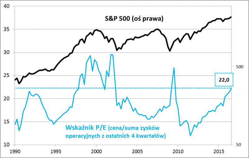 Pewnym problemem pozostaje jednak poziom wycen akcji. S&P 500 jest notowany z P/E (liczonym na podstawie zysków za ostatnie 4 kwartały) na poziomie ok. 22,0. Historycznie drożej było jedynie w finałowym etapie wielkiej hossy lat 90. (maksymalnie P/E przekroczył wtedy pułap 29,0), nie licząc chwilowego wyskoku P/E na początku 2009 r. na skutek ówczesnego przejściowego załamania wyników finansowych.