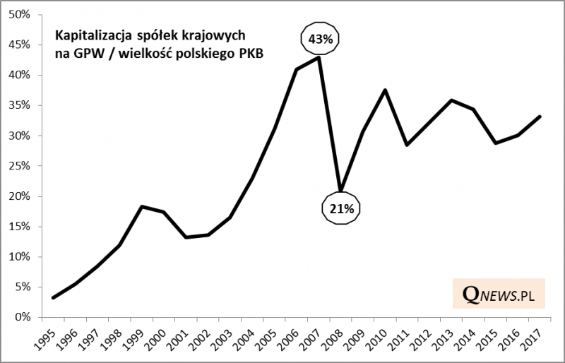 Widać, że obecny poziom współczynnika, który np. w USA bywa przez niektórych analityków traktowany jako wyznacznik przewartościowania/niedowartościowania akcji, jest mniej więcej w połowie przedziału wahań z ostatnich dziesięciu lat. Na szczęście daleko mu do rekordu z 2007 r., gdy sięgnął 43%. To argument za tym, że na dłuższą metę walory na GPW nie są nadmiernie drogie.