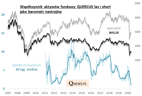 Tym razem weźmy pod uwagę omawiany komponent sam w sobie. Okazja jest o tyle dobra, że współczynnik lev/short "szoruje po dnie". Z kolei 10-tygodniowa średnia (10WMA) - którą stosujemy przy obliczaniu naszego Barometru w celu wygładzenia krótkoterminowych wahań - na koniec ostatniego tygodnia znalazła się ... rekordowo nisko (!). Nawet nieco niżej niż w dołkach z lat 2011-12. Aktualna wartość średniej to 1,11 (dla porównania, jeszcze na koniec zeszłego roku średnia wynosiła ponad 4,40).