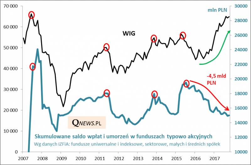 Dane Izby Zarządzających Funduszami i Aktywami dobitnie pokazują, czym różni się koniunktura na polskim rynku akcji w ostatnich latach od tej z poprzedniej hossy, zakończonej w 2007 roku. Wtedy pieniądze szerokim strumieniem płynęły do funduszy typowo agresywnych, akcyjnych, w tym szczególnie do podmiotów wyspecjalizowanych w walorach małych i średnich spółek ("MiŚ"). W obecnym cyklu wygląda to zupełnie inaczej. Inwestorzy ewidentnie stronią od polskich akcji, szczególnie w ostatnich dwóch latach.
