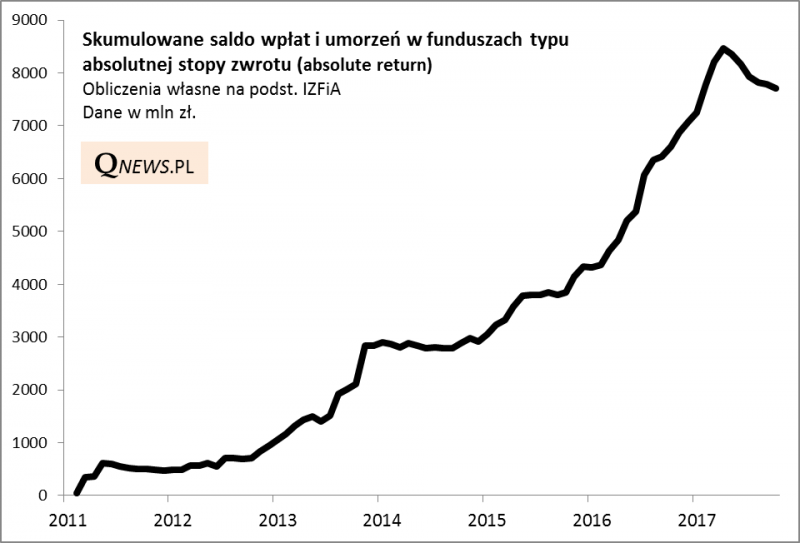 Szeroki strumień gotówki napływał za to w ostatnich latach m.in. do funduszy typu absolutnego zwrotu (absolute return). Z naszych wyliczeń wynika, że od kiedy IZFiA podaje odpowiednie dane (II 2011), do tej kategorii napłynęło netto w najlepszym momencie prawie 8,5 miliarda złotych.