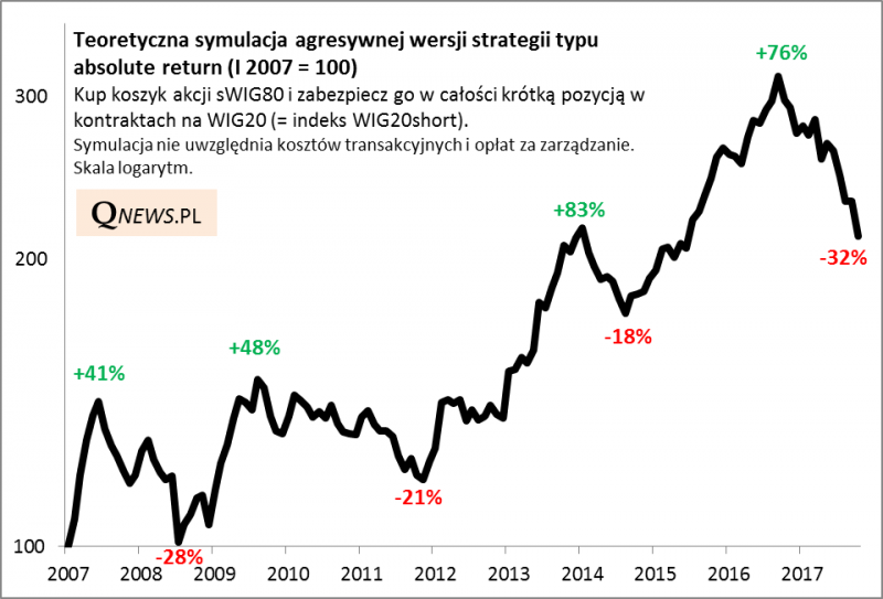 Uwaga - naszą symulację należy traktować jedynie jako zobrazowanie idei strategii absolute return, a nie jako benchmark. W praktyce fundusze stosują na ogół mniej lub bardziej złagodzone wersje strategii (część portfela w instrumentach dłużnych, dużo mniej spółek w portfelu, tylko częściowe zabezpieczenie pozycji akcyjnej, itp.).