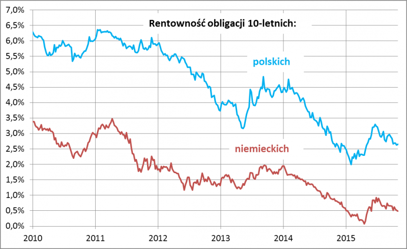 Skąd biorą się te tendencje? W skali globalnej widzimy kolejne działania banków centralnych, które pod wpływem ostatnich obaw o kondycję światowej gospodarki albo tną stopy procentowe (Chiny), albo zapowiadają większą stymulację w postaci QE (strefa euro), albo wstrzymują się z zaplanowanymi wcześniej podwyżkami stóp (USA). Zapowiedziane przez szefa EBC Mario Draghiego możliwe powiększenie skupu obligacji w ramach QE wyraźnie wywiera presję na spadek rentowności obligacji niemieckich i innych z Eurolandu (a przecież już teraz co miesiąc EBC wydaje 60 mld EUR na skup papierów).