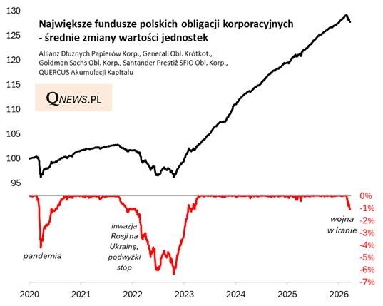 Turbulencje na rynku obligacji skarbowych, o których pisałem niedawno, w pewnym stopniu przeniosły się też na dług korporacyjny (emitowany przez firmy). Obliczony przeze mnie indeks obrazujący średnie zmiany wartości jednostek uczestnictwa pięciu największych funduszy w tej kategorii, który w ostatnich trzech latach niemal nieprzerwanie rósł w solidnym tempie, w marcu przeżywa zadyszkę największą od 2022 roku.