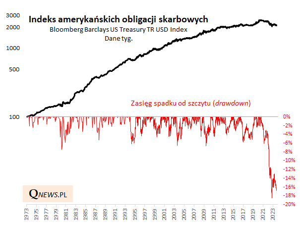Na skutek dalszego wzrostu rentowności, oznaczającego spadek cen rynkowych, indeks "skarbówek" za oceanem zaczął zakręcać w kierunku ubiegłorocznego dołka, a drawdown znów zaczął się pogłębiać (obecnie wynosi prawie -17 proc.). Poniższy wykres przypomina, że takiej zawieruchy bloombergowski indeks nie przeżywał jeszcze nigdy w całej swej historii, obejmującej już ponad pół wieku! Przed 2022 rokiem maksymalne obsunięcia wynosiły co najwyżej po 6-7 proc. i stanowiły wtedy najlepsze okazje do zakupów. Nic dziwnego, że wydarzenia ostatnich 2-3 lat określane są często jako prawdziwy szok dla inwestorów.