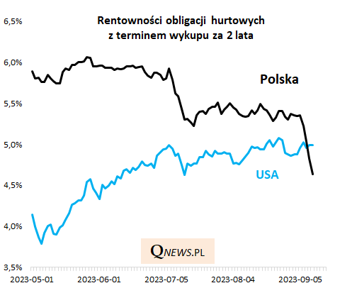 Nietypowa sytuacja na rynku obligacji skarbowych. Rentowność polskich papierów 2-letnich znalazła się poniżej rentowności analogicznych obligacji USA. Podczas gdy za oceanem rentowność papierów skarbowych jest "trzymana" wysoko (w okolicy 5 proc.) przez obawy przed dalszymi podwyżkami stóp procentowych przez Fed, to na naszym rodzimym rynku rentowność 2-latek tąpnęła po zaskakująco mocnej, "przedwyborczej" obniżce stóp przez RPP i zapowiedziach możliwych dalszych cięć.