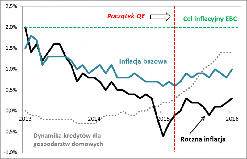A jak po roku wygląda realizacja ekonomicznych celów polityki EBC? Oficjalnym celem było/jest zaradzenie „ryzyku przedłużonego okresu niskiej inflacji”. Według EBC mechanizm oddziaływania QE miał być następujący: skup aktywów sprawia, że firmy i konsumenci mają dostęp do taniego finansowania, co z kolei wspiera inwestycje i konsumpcję, a to w ostatecznym rachunku sprowadza wskaźnik inflacji do celu na poziomie 2% w skali roku.