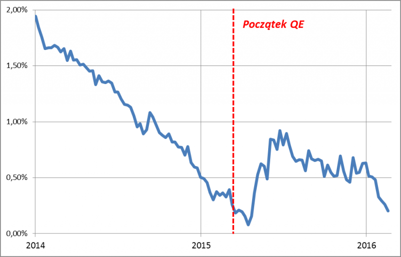 Mija rok od rozpoczęcia szeroko zakrojonej polityki QE (quantitative easing, „luzowanie ilościowe”) przez Europejski Bank Centralny pod wodzą Mario Draghiego. Według programu, oficjalnie zwanego „rozszerzonym programem skupu aktywów”, od marca 2015 r. EBC wydaje 60 mld EUR w skali miesiąca na zakup m.in. obligacji skarbowych rządów strefy euro (a oprócz tego także zabezpieczonych obligacji sektora prywatnego – te były nabywane już wcześniej). Początkowo skup zaplanowano co najmniej do września 2016 r., później termin przedłużono do marca 2017 r.