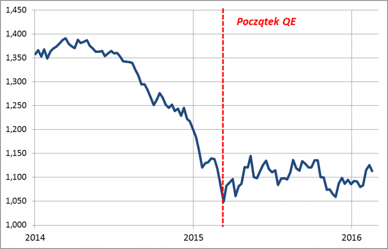 Przypomnijmy sobie, jakie były oczekiwania rynkowe w momencie uruchomienia skupu aktywów. Po pierwsze liczono na wysokie ceny, a co za tym idzie skrajnie niską rentowność obligacji skarbowych (bo to przecież właśnie one podlegają skupowi). To z kolei miało wywoływać odpływ kapitałów za granicę (np. w kierunku bardziej rentownych amerykańskich obligacji), co z kolei miało prowadzić do osłabiania się euro, np. względem dolara. To natomiast miało pomagać europejskiemu eksportowi (jego największa porcja trafia do USA) i ogólnie całej gospodarce. A od lepszej koniunktury ekonomicznej już prosta droga do hossy na giełdach, szczególnie że niskie rentowności obligacji miały sprzyjać wyższym wycenom akcji.