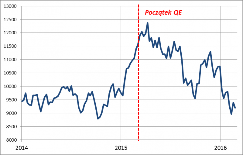 Wszystko to wyglądało bardzo logicznie i elegancko, nie powinno więc dziwić, że inwestorzy zabrali się za dyskontowanie tego mechanizmu na długo zanim Mario Draghi oficjalnie ogłosił start QE. Przypomnijmy, że w okresie poprzedzającym uruchomienie skupu rentowność niemieckich obligacji 10-letnich po spadku trwającym przez cały 2014 rok zeszła poniżej 0,1%. Kurs euro względem dolara na krótko po uruchomieniu QE zszedł w okolicę 1,05 (rok wcześniej był blisko 1,40). Z kolei niemiecki DAX od października 2014 r. do kwietnia 2015 r. (czyli miesiąc po starcie skupu) urósł o 40 proc. (!).