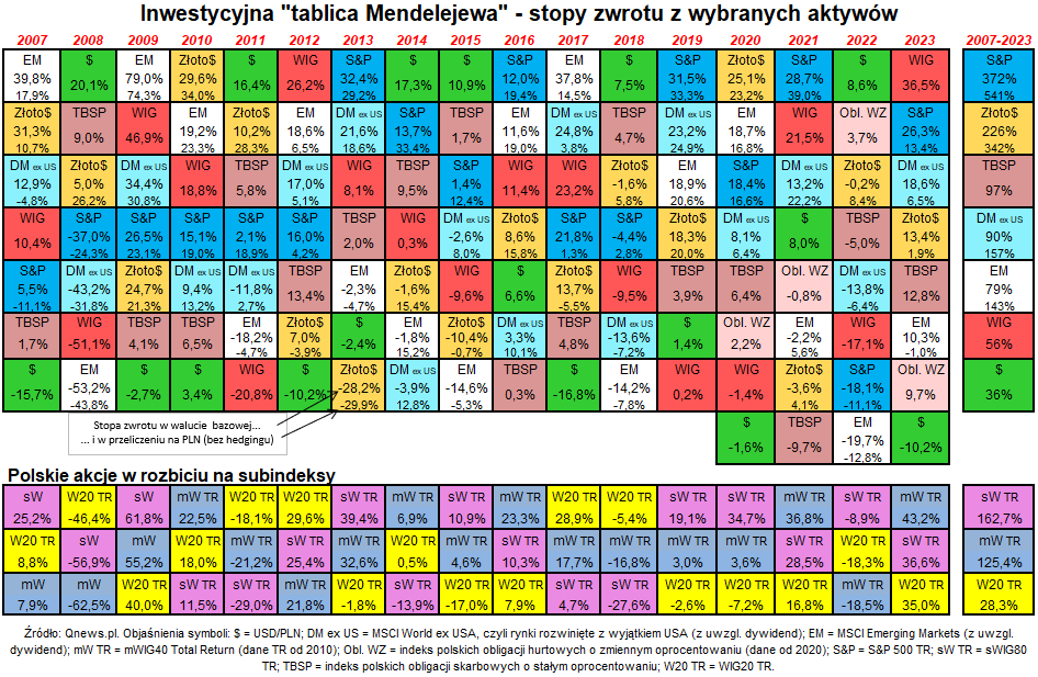 Przejdźmy teraz krok dalej. Jak zawsze przy okazji analizowania inwestycyjnej „tablicy Mendelejewa” staramy się wysnuć wnioski na kolejny rok i ogólnie na dalszą przyszłość. Jakie są konkluzje tym razem? Najprostszy jest długoterminowy wniosek, który wynika z ostatniej, oddzielnej kolumny w naszym zestawieniu, pokazującej wieloletnie stopy zwrotu, obejmujące cały okres lat 2007-2023. Na długą metę w portfelu opłaca się mieć w portfelu dużo akcji, zarówno zagranicznych, z akcentem na amerykańskie, jak i polskich, w tym drugim przypadku z bardzo mocnym akcentem na walory małych i średnich spółek (duże z WIG20 radziły sobie na przestrzeni wielu lat relatywnie słabo).