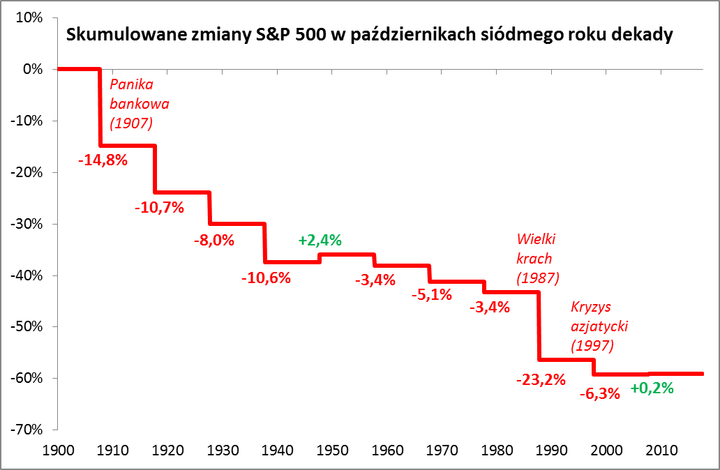 "Przekopywanie się" przez dane historyczne prowadzi do intrygującej obserwacji na temat rozpoczynającego się października. Wiadomo, że słynie on z krachów, takich jak ten w 2008 roku po upadku Lehman Brothers. Oczywiście było też wiele lat, w których ten miesiąc wcale nie był taki zły, ale ten rok według statystycznych ciekawostek plasuje się wśród pechowych pod tym względem. Dlaczego? Bo mamy siódmy rok dekady. A okazuje się, że w takich latach kończących się na "7" niemal wszystkie październiki historycznie przynosiły straty.