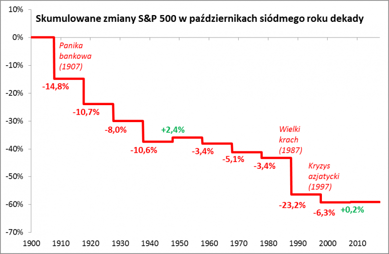Gdyby ktoś kupował akcje (z koszyka S&P 500) na koniec września roku z cyfrą „7” na końcu i sprzedawał je na koniec października, to w całym tym okresie straciłby od początku XX wieku prawie 60% kapitału. A przecież na przestrzeni wszystkich tych dekad indeks w pozostałych miesiącach urósł w sposób astronomiczny. Być może jest to tylko zwykły zbieg okoliczności, do którego „dokopać się” można w historycznych danych...