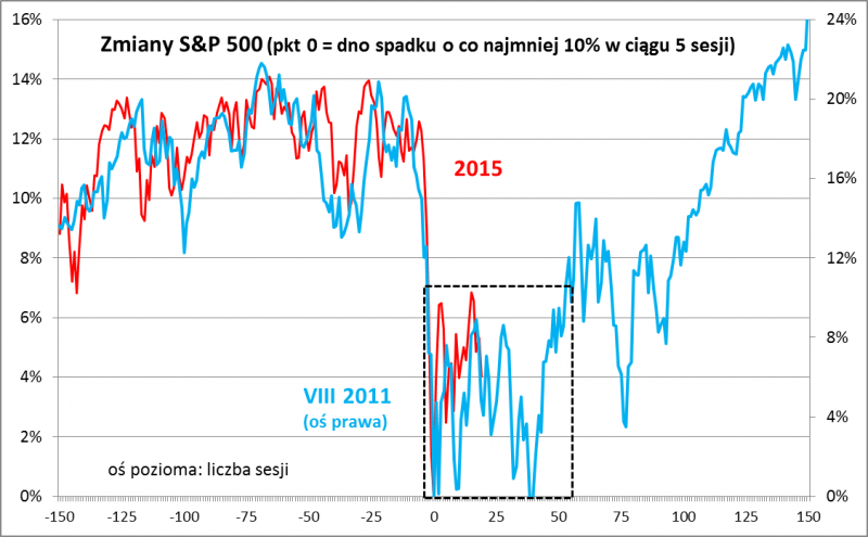 Jeśli popatrzymy na historię, to dojdziemy jednak do wniosku, że nie jest to żadna anomalia - tak po prostu musi być. Jak już pisaliśmy, w większości historycznych przypadków po tak silnych spadkach jak te w sierpniu amerykański S&P 500 potem zwykle zawracał w kierunku dołka. Widać przykładowo duże podobieństwo obecnej sytuacji do tej sprzed czterech lat.