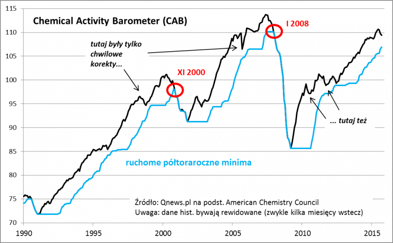 Kątem oka warto jednocześnie obserwować sprawdzone wskaźniki makroekonomiczne. Jednym z nich jest monitorowany przez nas "barometr aktywności w przemyśle chemicznym" (CAB). Według najnowszego odczytu wskaźnik ma za sobą trzeci spadkowy miesiąc z rzędu. To oznaka pewnej zadyszki w amerykańskiej gospodarce, stanowiąca fundamentalne wytłumaczenie ostatniej nerwowości rynkowej. Podobne zniżki wskaźnik zaliczył w trakcie poprzednich największych korekt na Wall Street (lata 2010-2012).