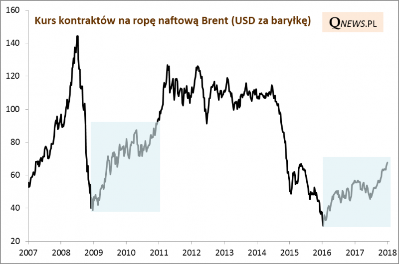 Reasumując, ropa naftowa jest w silnym trendzie wzrostowym, który pod względem czasu trwania i zasięgu do złudzenia przypomina to, z czym mieliśmy do czynienia w latach 2009-2011. Jeśli trzymać się tej analogii, to do potencjalnego szczytu (na wiosnę?) ropa zdąży się sporo podrożeć. Zauważmy, że lokalny szczyt w notowaniach ropy w 2011 roku skorelowany był z lokalnym przesileniem na globalnych rynkach akcji. Oczywiście nie ma żadnej gwarancji, że nadal będziemy mieli "powtórkę z historii" - w którymś momencie widoczne na wykresie ścieżki mogą się "rozjechać".