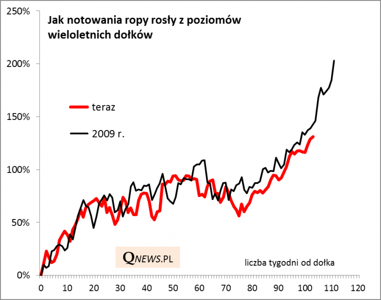 Kilkukrotnie zwracaliśmy w naszych komentarzach uwagę, że ceny ropy naftowej poruszają się niemal perfekcyjnie po ścieżce z lat 2009-2011. Podobnie jak wtedy notowania odbiły się z wieloletnich minimów. Co ciekawe, ta analogia cały czas się utrzymuje...
